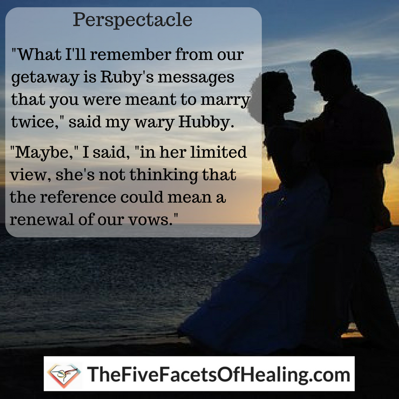 “You have to understand that she receives messages in her frame of reference, based on her own experiences,” I said. “For instance, she only saw three children, but she may have been only picking up on the kids here on earth. And the marriage thing? I was engaged before I met you, remember? AND, I’ve often thought about the two of us renewing our vows, especially after all that we’ve survived and worked through. Nothing was said about who I’d marry the second time around.”