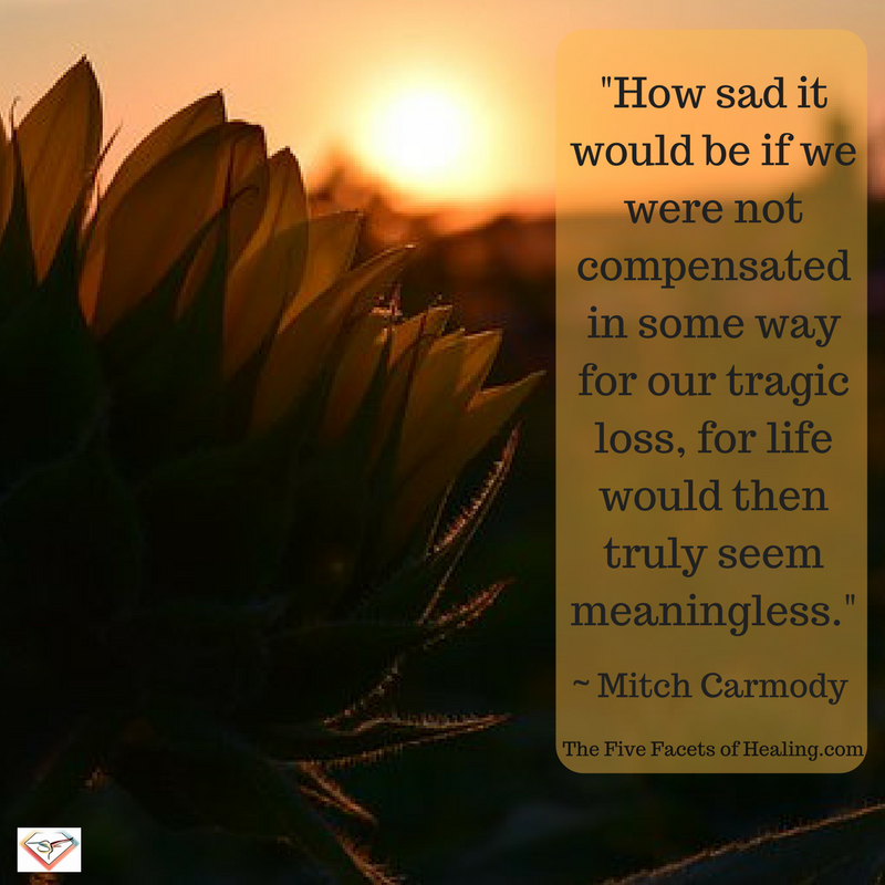 Through the loss of my son and many family members I have learned much on the journey. I found that I love deeper, I smell flowers longer, and I savor the sunsets more. I feel the best when helping others and I thank God for my every breath. These are all good things to have come to me in the midst and aftermath of horrific pain. How sad it would be if we were not compensated in some way for our tragic loss, for life would then truly seem meaningless.
